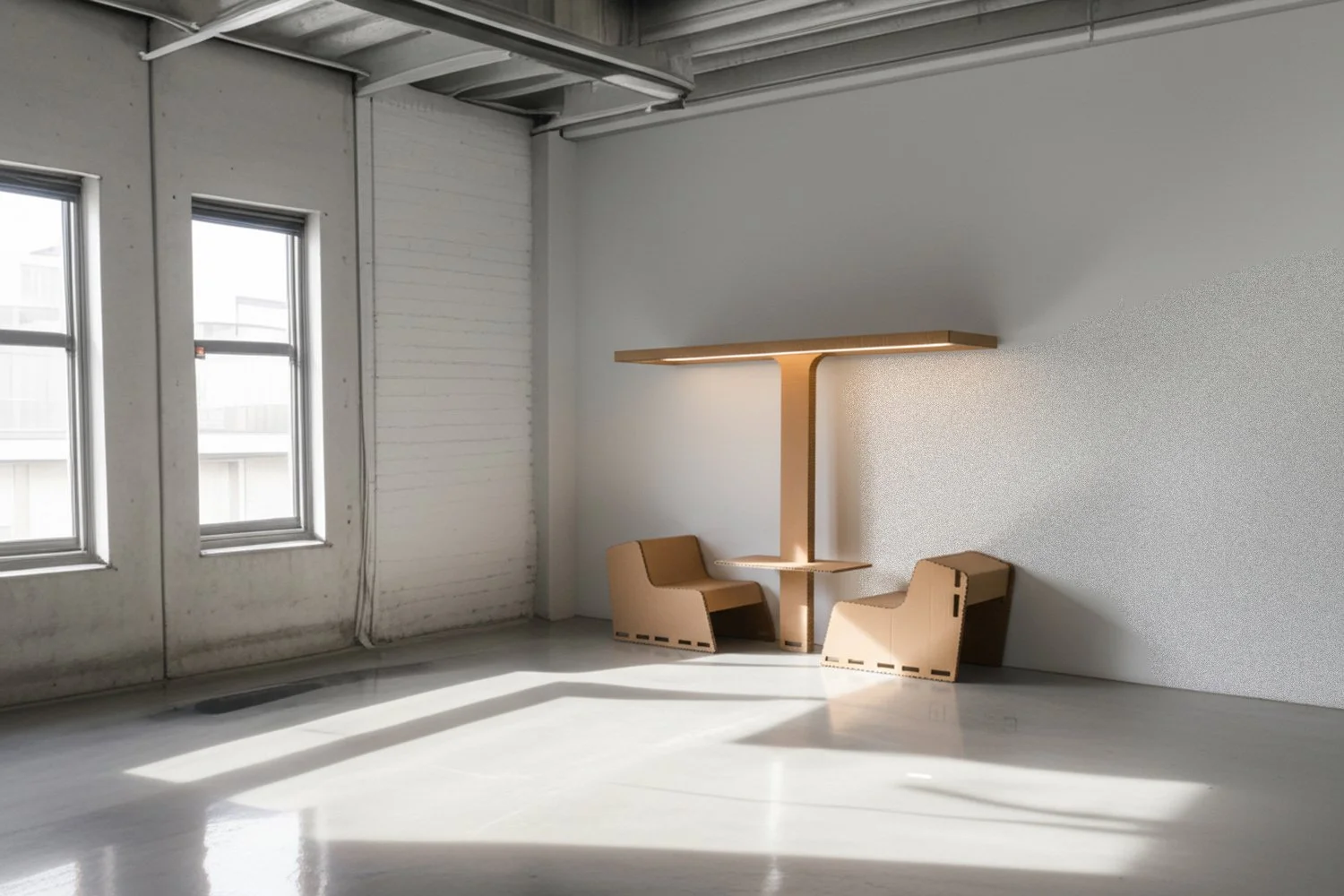 a system of bench seats, tablets, and overhead lighting provide a collaborative hub. the vertical column carries the electrical raceway and controls for lighting and charging ports, as well as structural support for mounting the pivoting tablets. for outdoor applications, a solar panel may be added.