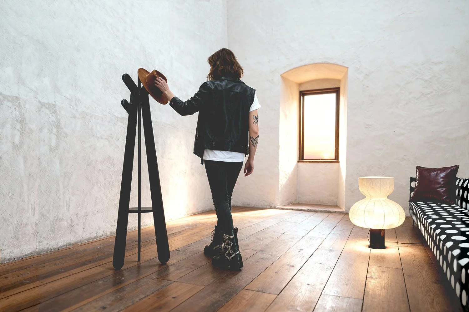 the tree is a happy place for coats, hats, and gear. made from appleply, a sustainably harvested wood blend that’s fsc certified. the THREE legs and ring notch securely with a simple interlock assembly. designed to ship flat. the tree is finished in a water-based, zero V.O.C. top-coat. made in Oregon.